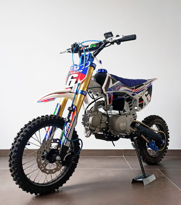 La Pit Bike NCX THOR è dotata di un motore 4 tempo, raffreddamento ad aria, 125cc di cilindrata, pneumatici anteriori da 14 e posteriori da 12, freno anteriore e posteriore a disco.